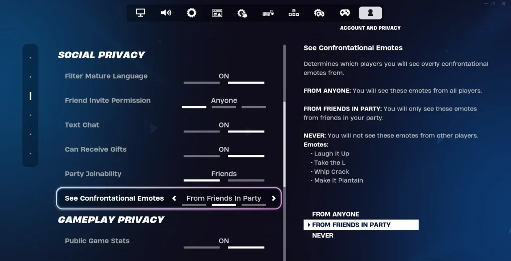 If you don’t want to see any Confrontational Emote from anyone in the game, follow the steps mentioned below: