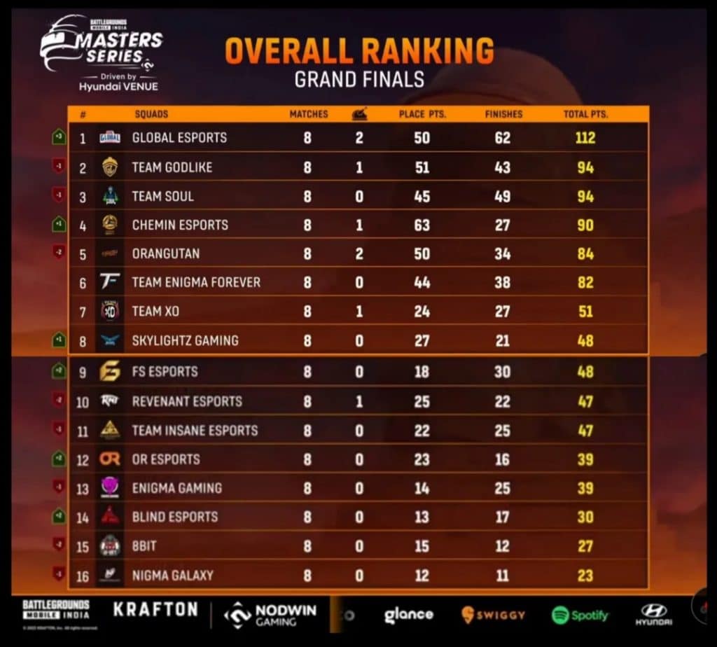 The second day of the BGMI Masters Series 2022 grand finals ended with Global Esports finishing at the top of the overall leaderboard. The team scored a total of 112 points in 8 matches. Team Godlike finished at the second spot with 94 points followed by Team Soul with 94 points and Chemin Esports with 90 points.