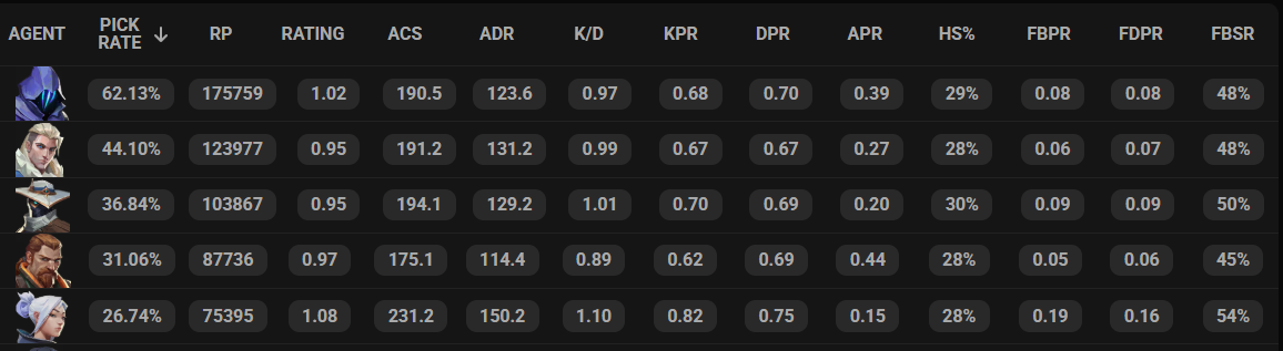Agents like Jett, Omen, Sova, and Cypher continue to dominate the pro scene with consistently high pick rates, while others like Sage, Reyna, Brimstone, and Phoenix go nearly unpicked in every single event.