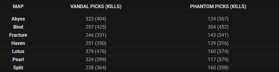 Taking a look at the map data from the event, we can see that while Vandal remains the most picked gun in every single map, the Phantom actually managed to get more total kills in Bind and Fracture.