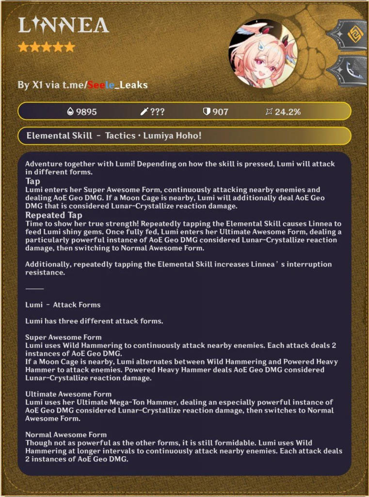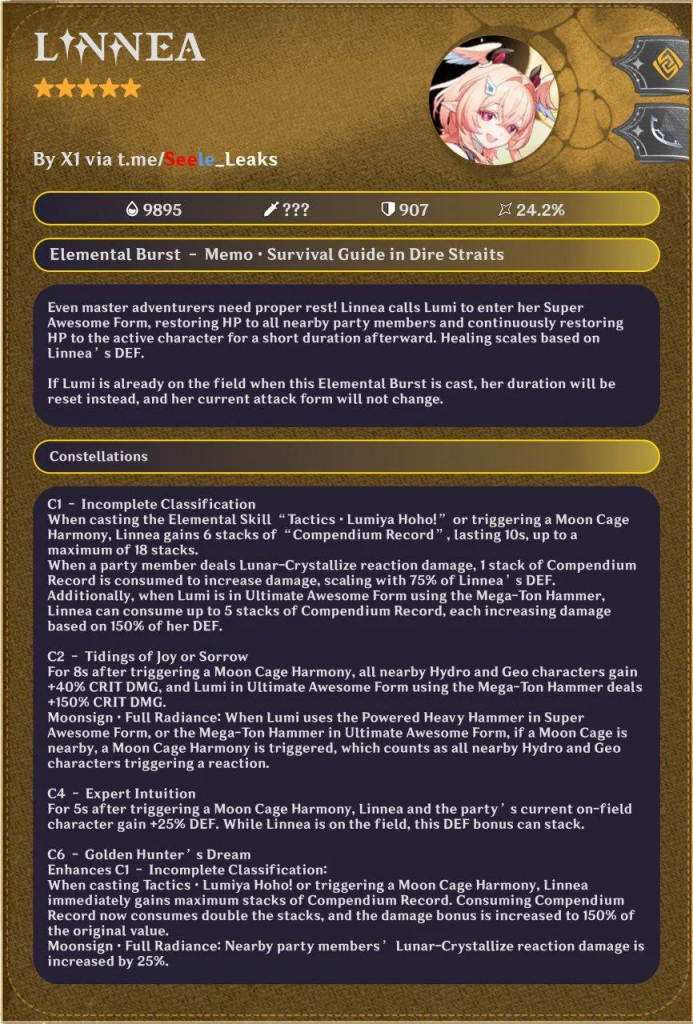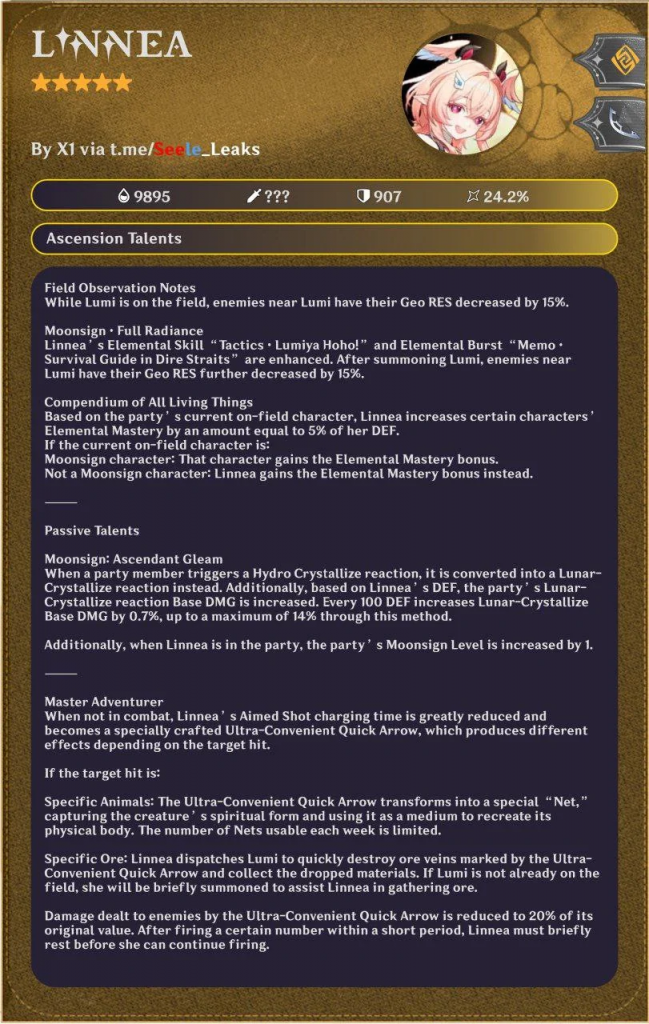 According to several prominent Genshin Impact leakers, Linnea will be featured as part of the upcoming Luna VI banners. She is expected to be a Lunar Crystallize sub-DPS and support character who’s also an advisor to the Adventurers’ Guild and possesses an “extensive knowledge in the life sciences.”