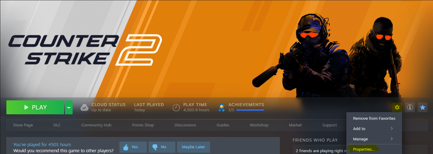 First, head over to your Steam Library and select Counter-Strike 2. Now click on the gear icon located at the right-hand side of your screen and hit ‘Properties’.