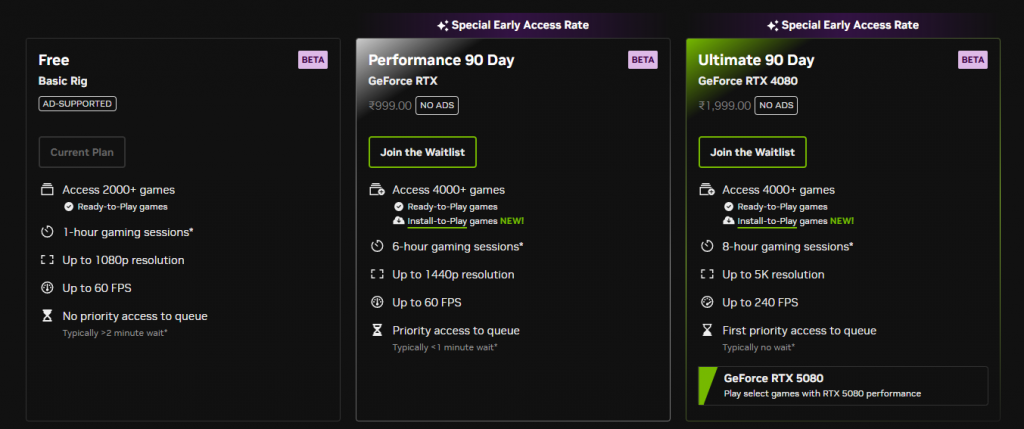 The Performance tier is priced at INR 999 and provides access to over 4,000 games, up to 6-hour gaming sessions, 1440p at 60 FPS streaming, and priority queue access. Meanwhile, the Ultimate tier will cost you INR 1999, but it offers 8-hour sessions, up to 5K at 240 FPS, and top-priority server access, which typically results in little to no waiting time