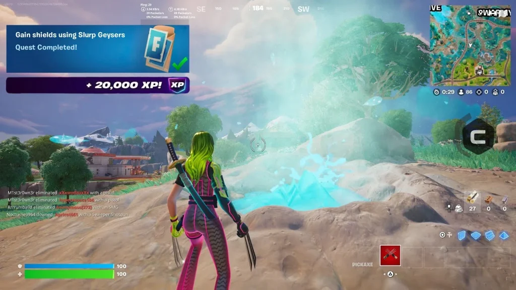 The “Gain Shields Using Slurp Geysers” weekly challenge involves collecting a total of 100 shields from geyser activations. Because each activation rewards 30 shields, you would need at least four activations to achieve this goal. Completing the quest awards 20,000 XP, and it is an important source of Battle Pass progression.