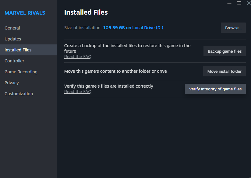 If you notice that both the Steam and game servers are up and running, you’ll need to verify your file integrity to fix this issue. To do so, right-click Marvel Rivals on your Steam Library and head to Properties > Installed Files. Now, simply click on “Verify Integrity of Game Files” and wait till the verification process is complete.