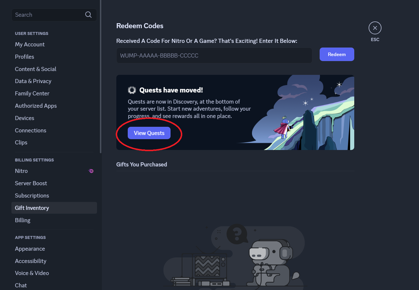 To find the Quests page on Discord, launch the app and click on the Settings cog located towards the bottom-left side of your screen. Once done, go to your ‘Gift Inventory’ and hit ‘View Quests’ to find a list of Discord Quests that you can complete for various rewards.