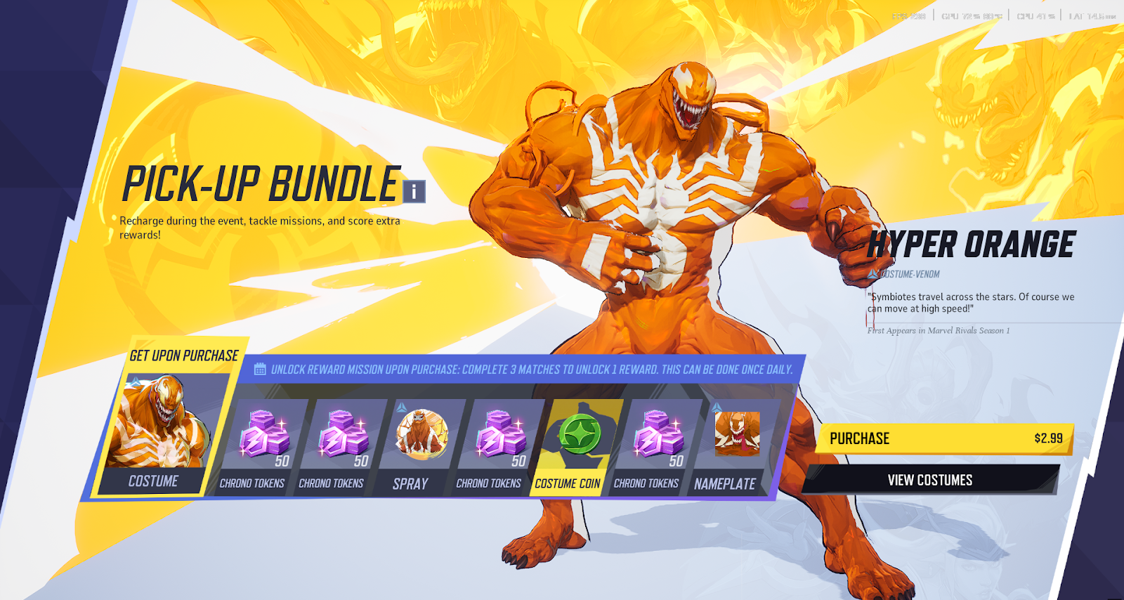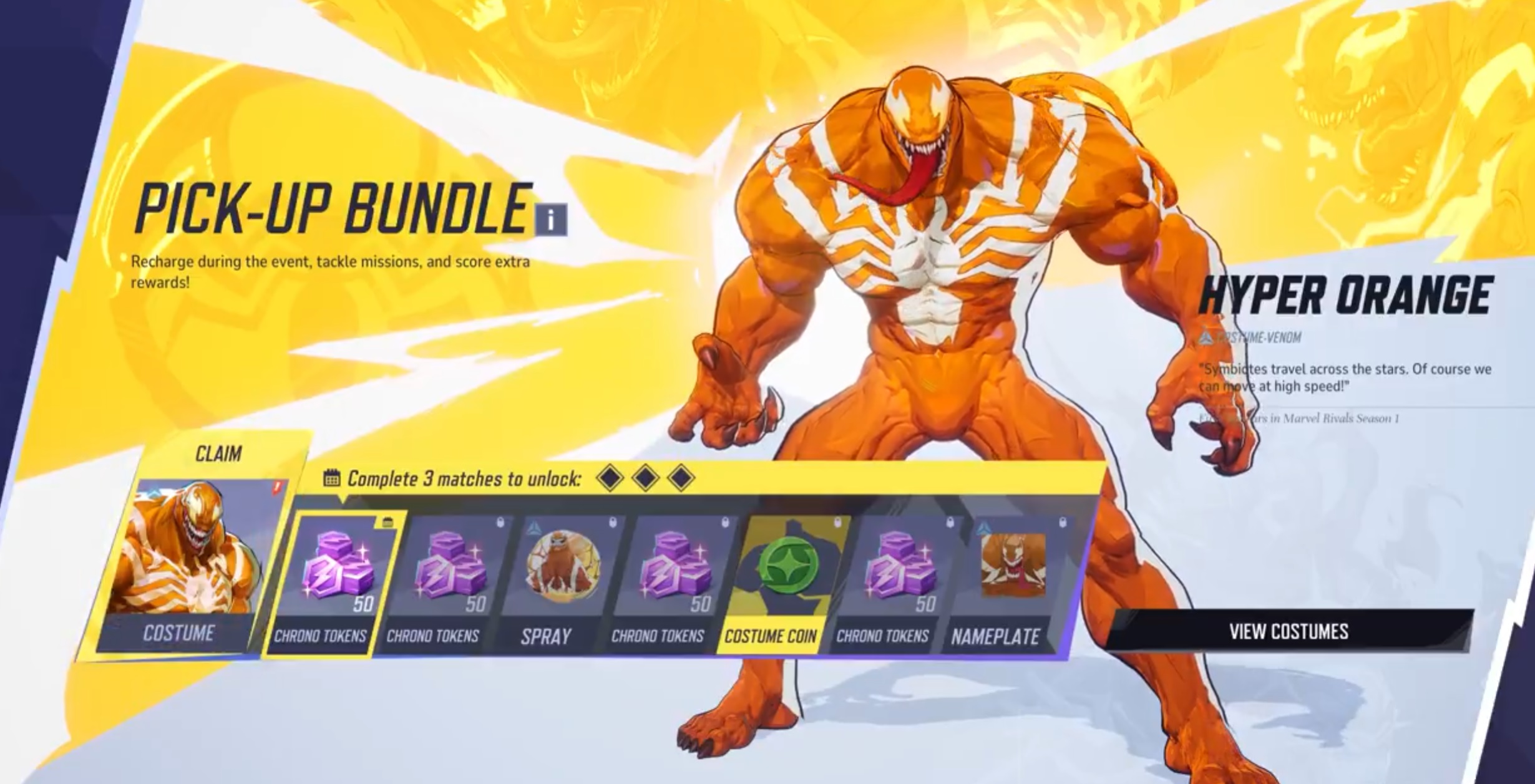 As mentioned earlier, you’ll get the Hyper Orange Venom costume immediately upon purchasing the bundle, but you need to complete three Marvel Rivals Games to get each additional reward.