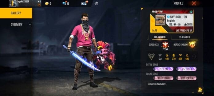 SkyLord goes by the same name in Free Fire as well and his in-game character ID is 77985476. Let us take a look at his stats: