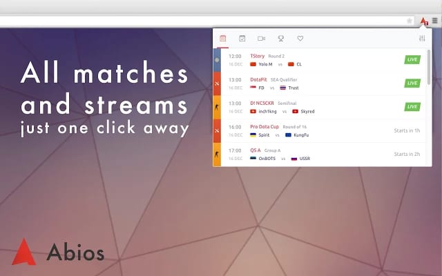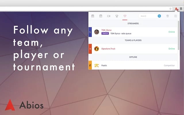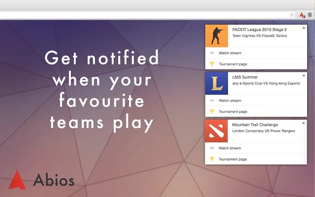 Users will never miss a match after installing the Abios extension. All matches and their streams are always one click away. The availability of the Abios Match Ticker Extension will enable more gamers to find events, scores and enjoy esports. Abios has added a subscription feature to the new extension allowing you to not only follow specific games, but any team, player or tournament in their 11 game coverage. You can also be notified when popular streamers go live. With the addition of live updated results and tailored subscriptions, the extension can manage all the esports you can fit into your calendar. You won’t miss a match.
