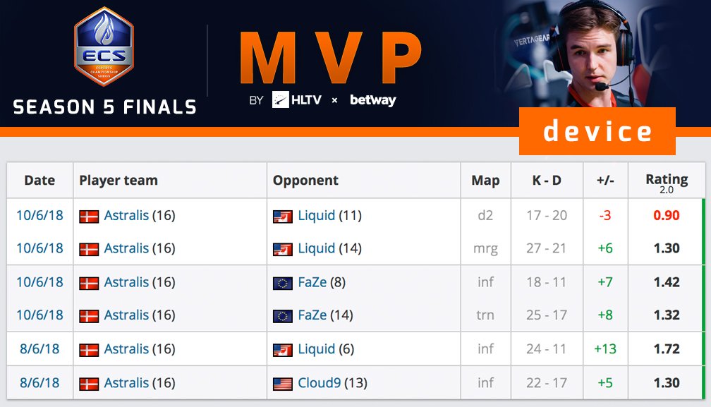 Nicolai ‘device’ Reedtz was named MVP of the tournament by HLTV considering his consistent gameplay in the grand finals and throughout the tournament. This is the sixth MVP award claimed by device, the second at ECS events after also scooping the honour in Astralis’ title-winning campaign back in Season 2.