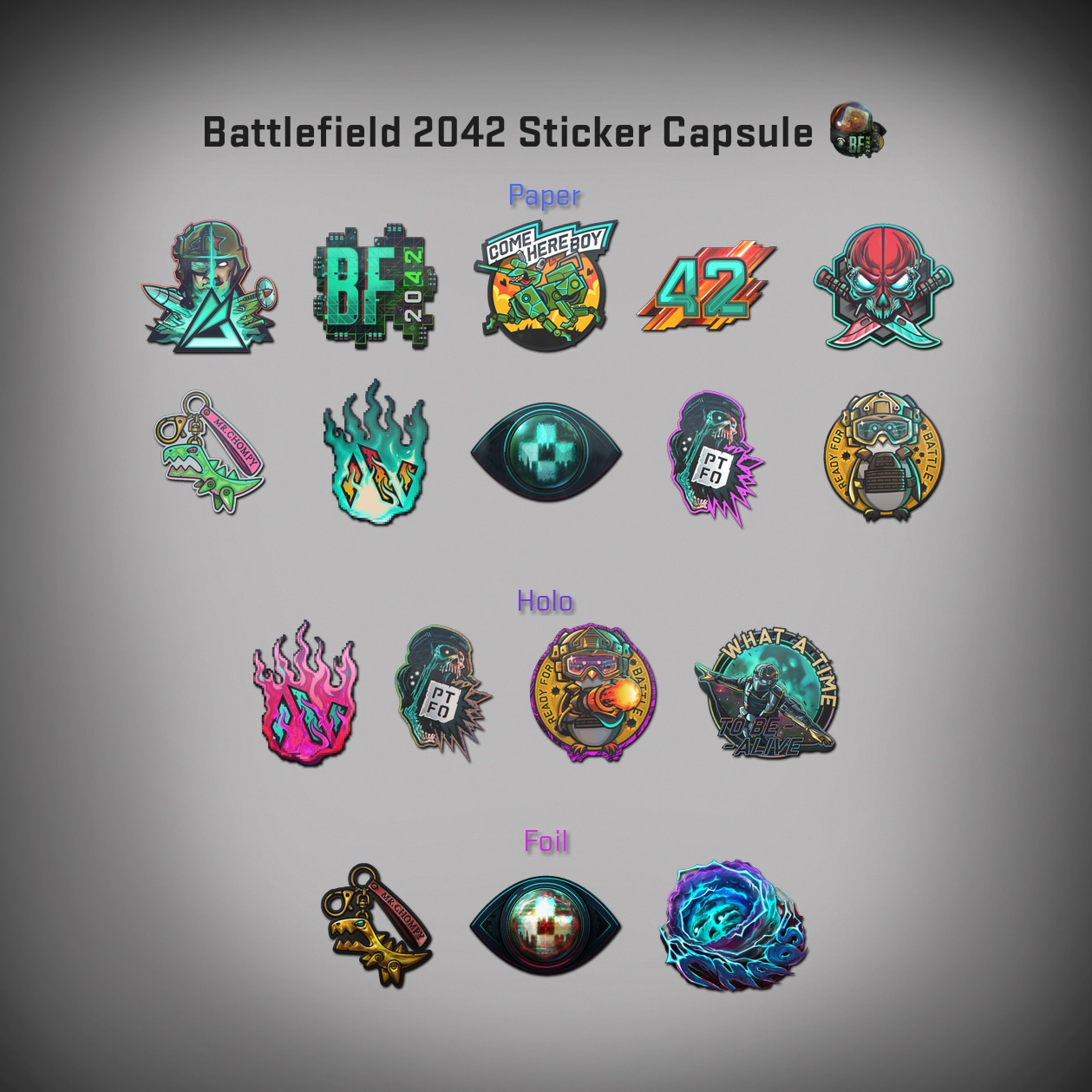 The new BF 2042 sticker capsule consists of 12 Unique Designs with 10 Paper stickers, 4 Holo and 3 Foil Stickers and is available for purchase in-game in CSGO.