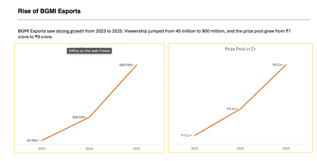 In 2024, total BGMI esports viewership stood at 308.56 million. In 2025, that number reached 930 million, a 201% increase in a single year. Alongside that, BGMI esports IPs generated 984 million YouTube impressions and reached 86.78 million unique viewers in 2025 alone.
