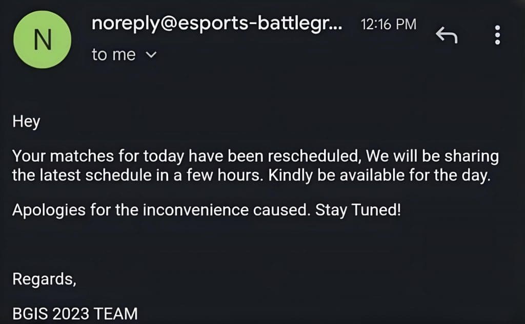 Teams scheduled to play in BGIS 2023 matches today have encountered disruptions as they received an email from the organizers. The message notified the teams that their today’s matches have been postponed indefinitely due to unforeseen reasons. The email stated, “Your matches for today have been rescheduled. We will be sharing the latest schedule in a few hours. Kindly be available for the day. Apologies for the inconvenience caused. Stay Tuned! – BGIS 2023 Team.”