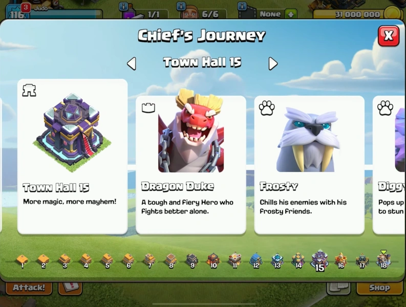 To eventually unlock the Clash of Clans Dragon Duke, you will need to upgrade your Hero Hall to Level 9. Consequently, this means the hero will be exclusively available to players who have reached at least Town Hall 15. If you check the Chief’s Journey tab at TH15 right now, you can already spot his official in-game profile.