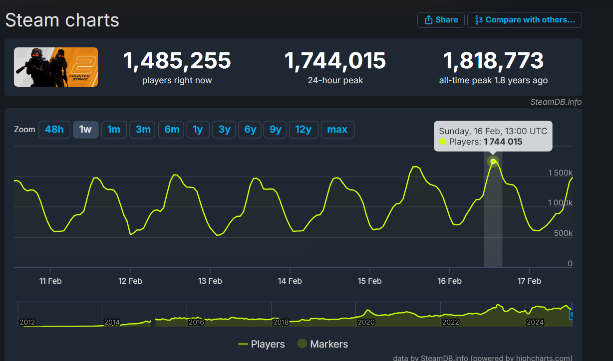 On February 16, 2025, CS2 reached a record-high player count on Steam, accumulating the highest number of players since its official launch in September 2023.