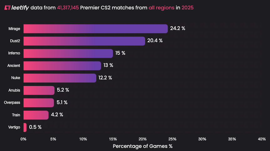 Over its one-year run, Train was played 1,942 times in total across all competitive levels. For comparison, Anubis, which was only in the pool for part of 2025 before being removed in June, still managed 1,552 matches.