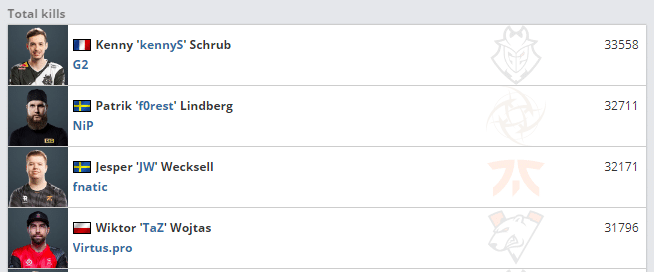 Kenny has recorded 33,558 official kills while veterans Patrik “f0rest” Lindbergand Jesper “JW” Wecksell are not far behind either. In the department of AWP frags, Kenny “kennyS” Schrub and Ladislav “GuardiaN” Kovacs have no close competitor. Two of them were regarded as the finest snipers in the history of Counter-Strike until the arrival of Oleksandr “s1mple” Kostyliev and Mathieu “ZywOo” Herbaut.