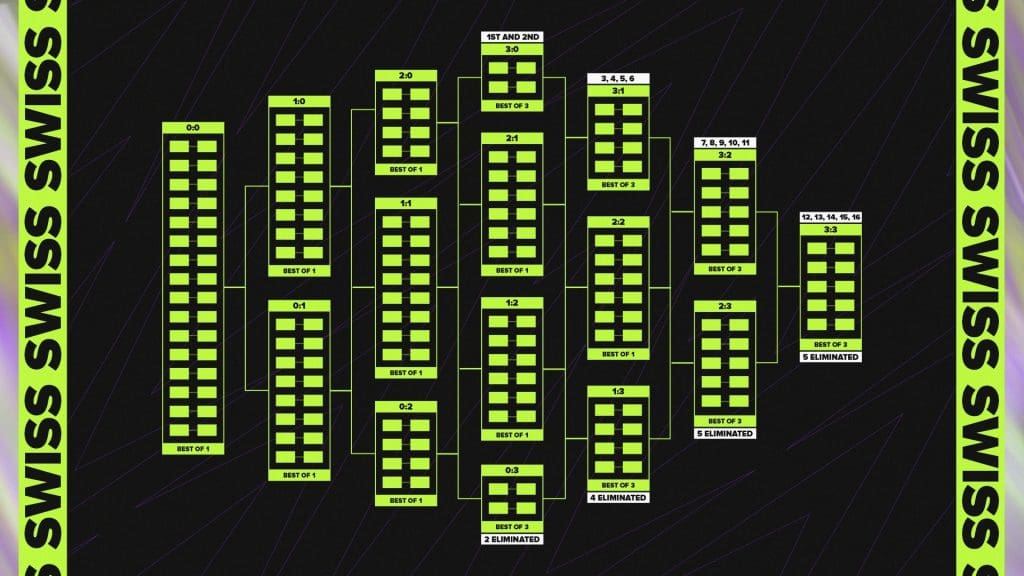 Teams will compete in best-of-one matches until the qualification/elimination matches, then the format will switch to best-of-three matches. From the Swiss Stage, 16 teams will then advance to Playoffs.