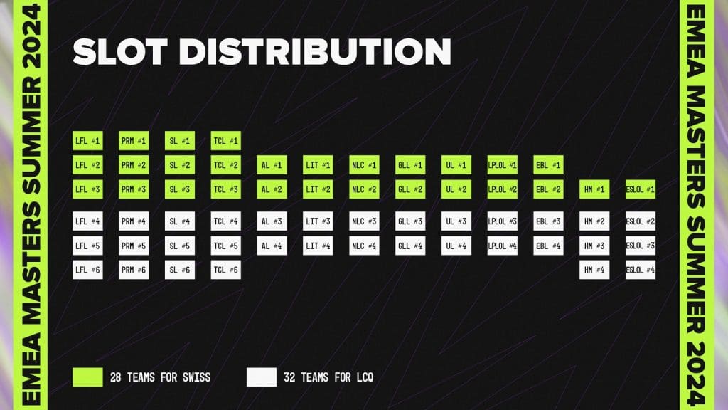 In the new format, all accredited ERLs will receive 6 slots each, where the top 3 from each league will directly qualify for the Swiss Stage while the next 3 will qualify for the Last Chance Qualifiers(LCQ). On the other hand Non-accredited ERLs will get 4 slots each. The number of teams from non-accredited ERLs qualifying into the Swiss Stage and the LCQ stage, will depend on the respective ERLs performance at recent EM events.
