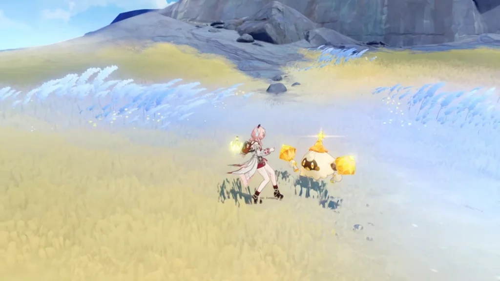 - Summoning (Tap): Linnea quickly gestures, bringing Lumi onto the field with a burst of Geo energy. Lumi immediately adopts a combat stance, ready to deal AoE damage.