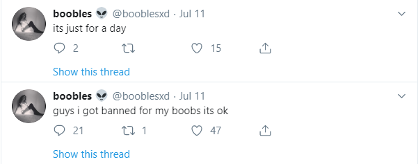 After these words on July 10, she got banned on Twitch. On July 11 B00blesxd tried to explain on her Twitter, that the reason for the ban was her outfit, not her ardent speech: