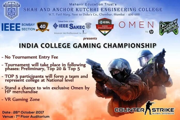Omen by HP and Mountain Dew ESL India College Gaming Championship LAN CS: GO tournament under the banner of “IEEE Bombay Section & IEEE SAKEC” will organize their first of its kind event on 26th of October at Shah and Anchor Kutchhi Engineering College from 11:30 AM onwards.