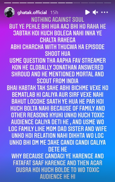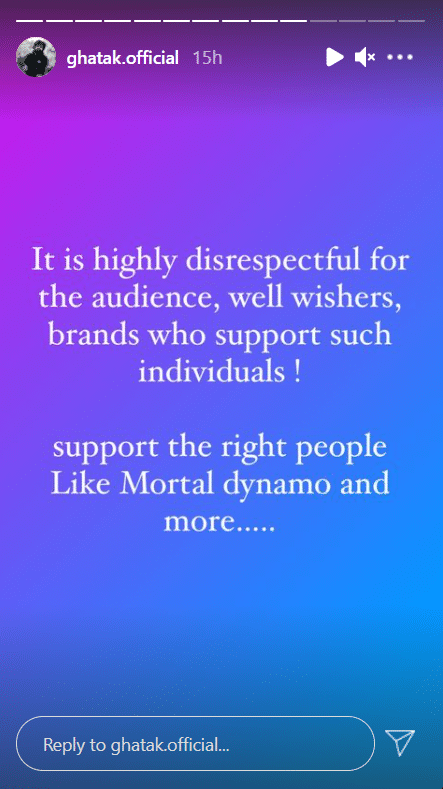 Ghatak, a fellow player from the old TSM roster took it to his Instagram and posted several stories criticizing Scout’s behavior. He stated that such actions are very disrespectful towards the audience, well-wishers, and brands.