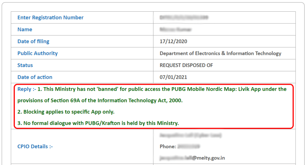 The response received was quite interesting as it was mentioned that the game is not “banned”. The exact response was “This Ministry has not ‘banned’ for public access the PUBG Mobile Nordic Map: Livik App under the provisions of Section 69A of the Information Technology Act, 2000.“