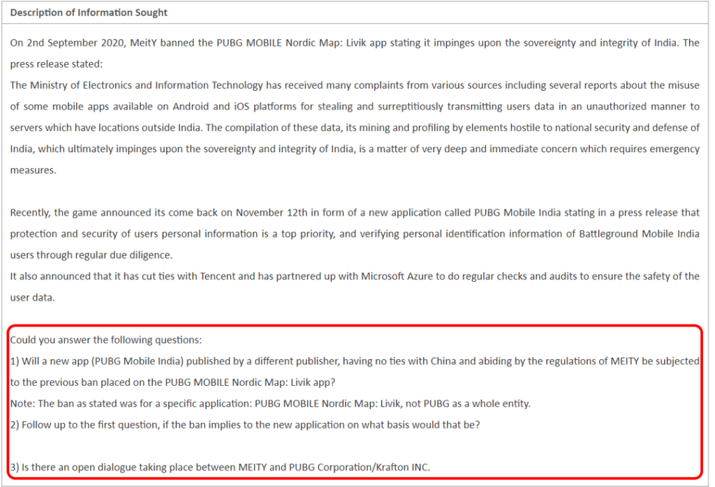 “Will a new app (PUBG Mobile India) published by a different publisher, having no ties with China and abiding by the regulations of MEITY be subjected to the previous ban placed on the PUBG MOBILE Nordic Map: Livik app? Note: The ban as stated was for a specific application: PUBG MOBILE Nordic Map: Livik, not PUBG as a whole entity.”