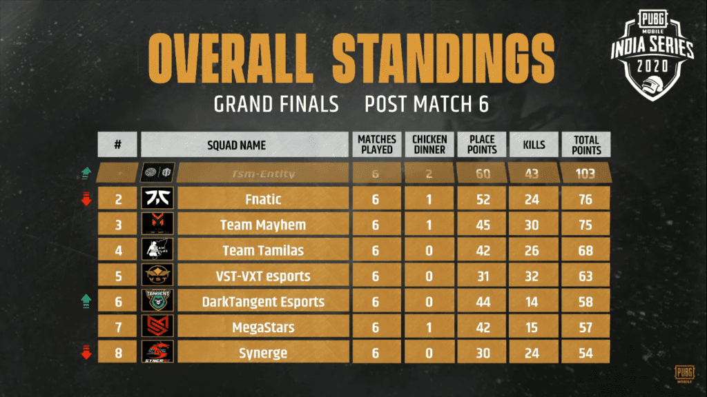 TSM-Entity won the match with 13 kills and 33 points. Team Fnatic came second with 5 kills and 19 points. Team VST-VXT Esports came third with 6 kills and 13 points.