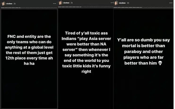 After this incident, C9’s Sixless posted several stories on his Instagram handle where he insulted the whole India PUBG Mobile community. This made the Indian fans really angry who then replied to Sixless on all the social platforms.