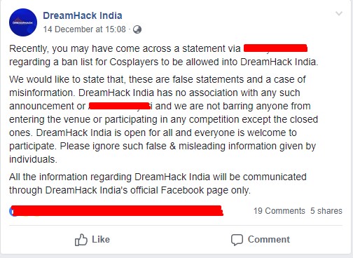 One of the employees of the organizer had announced on a Facebook group about an unannounced list of people, supposedly banned from attending the event. This, however, didn’t go well with the other section of the organizing team. DreamHack India in an official post publicly denounced the employee’s concern about sexual harassment and consent.