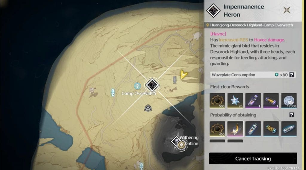 To defeat Impermanence Heron, you first need to find it. However, Impermanence Heron cannot be located unless you have reached Union Level 10. This will reveal Impermanence Heron’s location on the map. This boss is located near Camp Overwatch. The easiest way to reach there is by teleporting to any of the Resonance Beacons near Camp Overwatch.